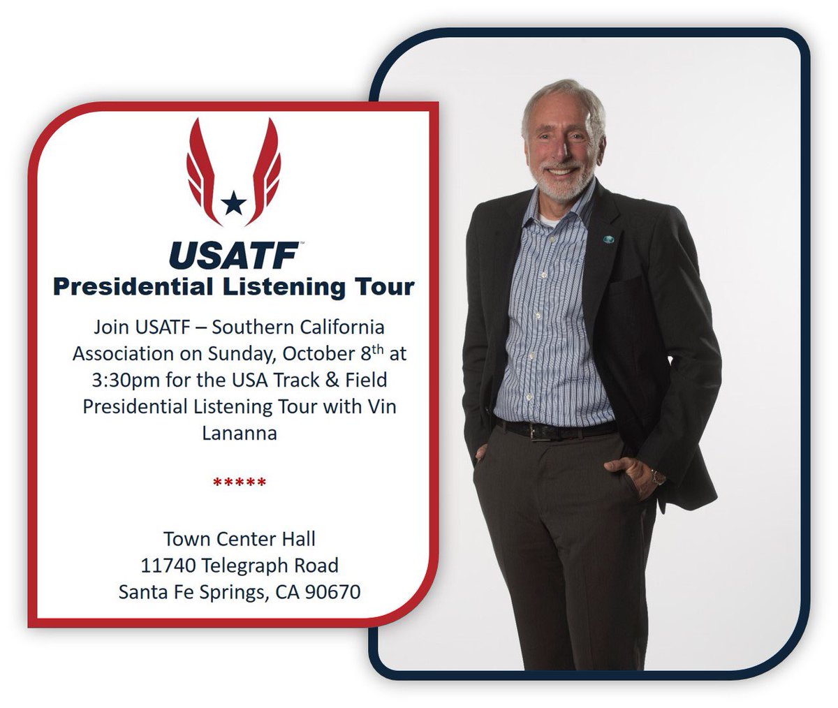 Please join USATF President Listening Tour with Vin Lananna on Oct 8th at 3:30pm. Hope to see you in Santa Fe Springs!
